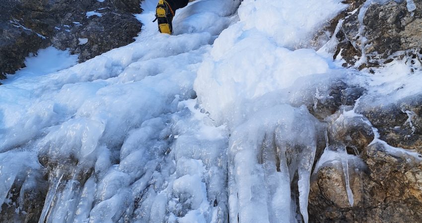 Slabo vreme je mimo, v hribih pa obilo snega in nekaj nam dobrodošlega mraza. Z Ivanom sva jo mahnila na vse zgodaj proti Trenti, tako da sva bila okrog devete ure v vstopu smeri. Pogled v prvo ledno stopnjo je bil vzpodbuden, saj je splazen. Sneg je zelo visoko, tako da je le kakšnih 6-7m […]